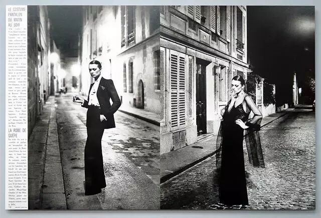 更重要的是,尽管吸烟装的设计灵感取自于男性服饰,但它并没有因此降低了女人们天生女性化的一面。Helmut Newton拍摄过的那组照片对这点做了很好的诠释。很多人都记得那一张模特穿着吸烟装,站在幽暗巷子中的照片,但在实际出版的杂志中,这张照片的对面,是同样一位模特几乎以相同的姿态和妆容,穿着一条雪纺长裙拍摄的影像。通过两幅图片对比,读者们能感觉到:所谓的雪纺长裙并没有让模特过度的女性化,而吸烟装也没有让她表现得像个男人一般。这样一股独立自主的的力量更多是来自模特本身。由此说来,吸烟装便是为女性主义分子们提供了制服一般的保护,使得她们不再至于被戏谑成“终日想着变成男人”。