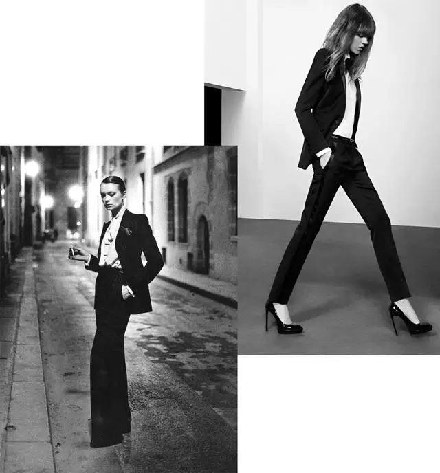 而Yves Saint Laurent的设计便是给了女性新的着装选择,从此女性身着裤装不再是只限于较为低级的体力劳动场所,而是逐渐可以夸大适用到其他任何地方。