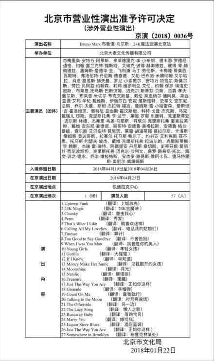 不过话有说回来了,在火星哥Bruno Mars「24K Magic」全球巡演北京站的演出许可文件上,他的歌名的中文翻译也是让人大跌眼镜。