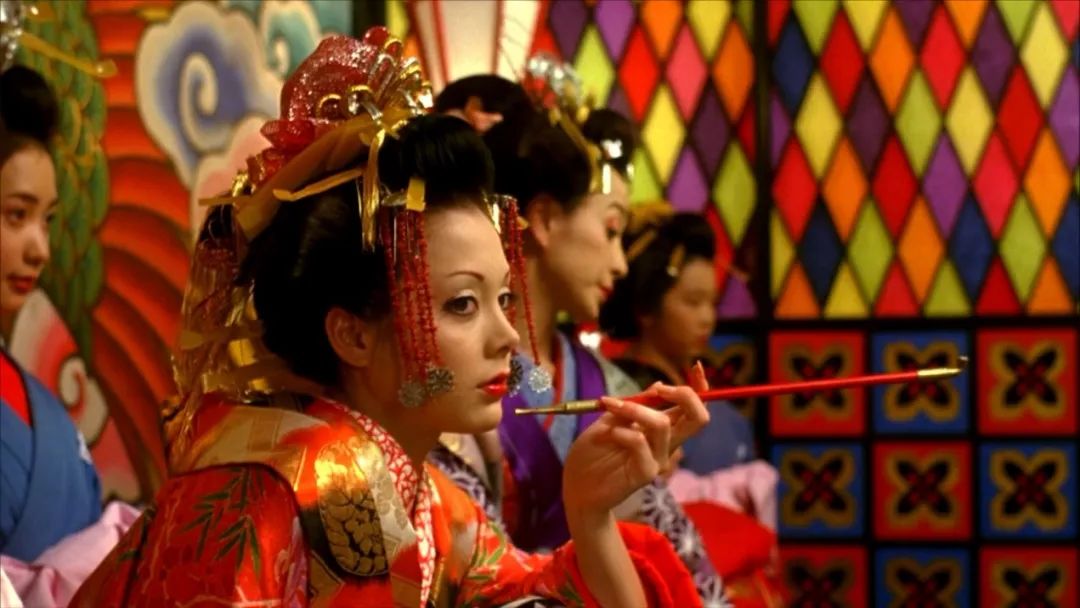 在玉菊屋内部和众花魁的镜头里,五彩的窗户、绘满图案的墙壁,展示的是玉菊屋的极度奢华;璀璨的头饰,浓艳的妆容,绚丽的服饰,极尽了艺伎们的娇媚美丽。