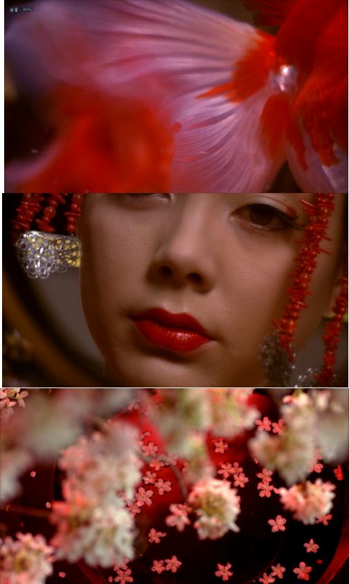 《恶女花魁》中丰富多样的色彩足以抓住观众的眼球。影片一开始便是从红白相间的金鱼特写镜头开始,然后转到水中落花。