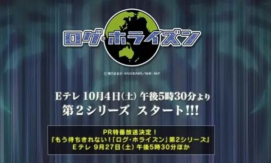 第2期《Log Horizon》近日于动画官网上公开了PV、制作以及声优阵容等情报,并预定将在10月4日下午开始放送,全25话。第2期的制作公司将从原本的SATELIGHT变更为Studio DEEN,监督、系列构成、音乐等基本上都保持了第1期时候的阵容。声优方面,第2期新登场的角色声优分别有供赘一族首领堇星(CV:代永翼)、D.D.D军师莉洁(CV:村川梨衣)以及偶像特托拉(CV:藤井ゆきよ)。