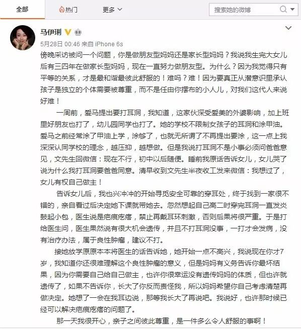 马伊琍在长文中称,一周前,大女儿爱马提出要打耳洞,征得文章同意后马伊琍便开始寻觅安全可靠的穿耳处,准备女儿下课就带她去,却忽然想起自己高二时穿完耳洞一直发炎鼓起小包,马伊琍随即打电话给医生,医生称:“有很大机会遗传,并且不打耳洞没事,一打才会发病,没有治疗办法,属于良性肿瘤,建议不打。”马伊琍便把医生的话告诉女儿,让7岁的女儿自己考虑清楚再做决定,爱马想了想后最终放弃打耳洞。