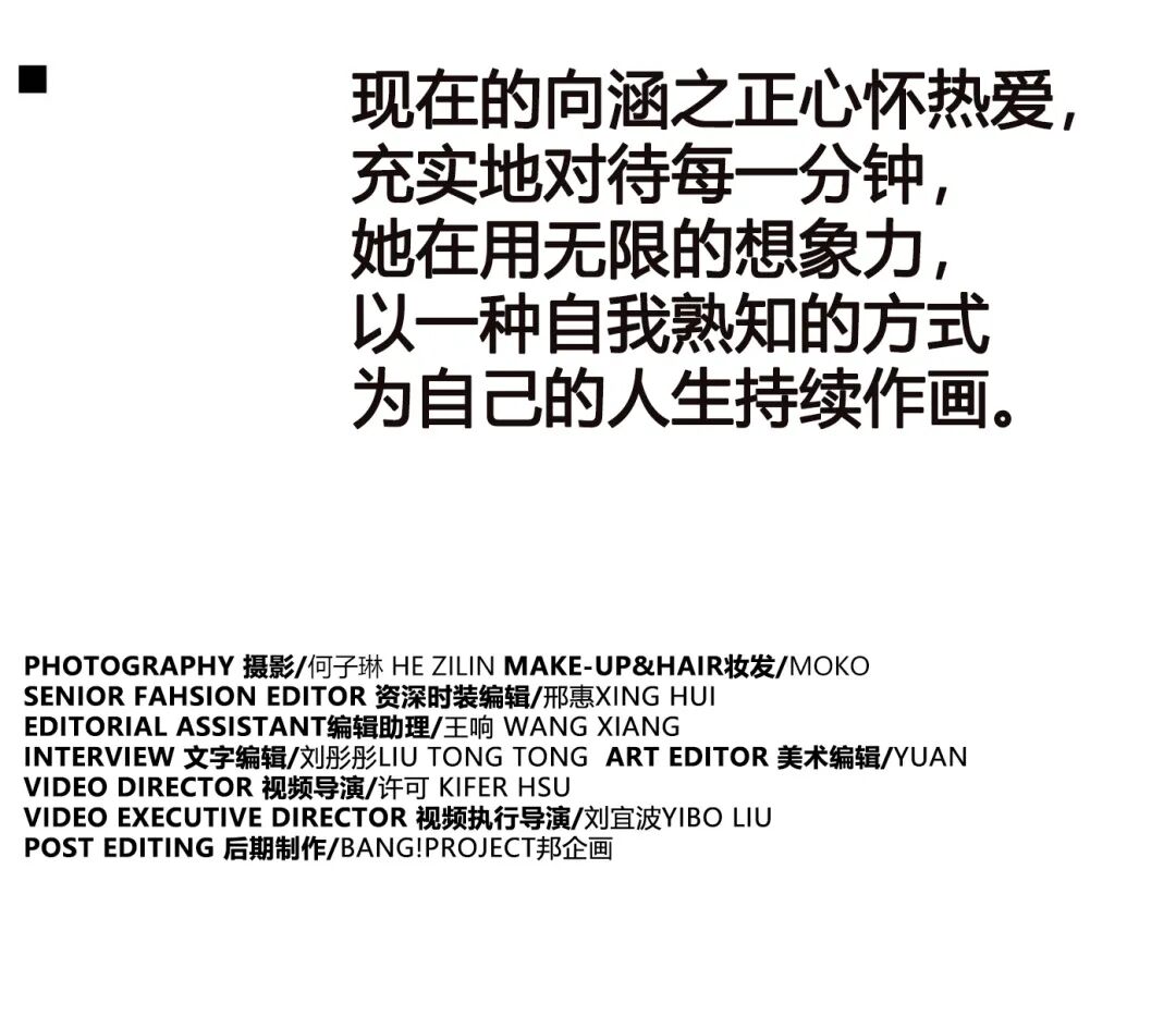 每个角色与观众见面时,她都会记录下关于角色的故事以及角色带给她的所有,这是属于向涵之的小习惯。每一个角色对她而言,不只是一次工作,更是一段人生,是度过别样的一段时光。“你每天都在经历着她发生的很多事情,你要相信自己是她,那她的所有经历你是不可能没有感觉的。”进入片场,灯光打下,镜头移来的时候,向涵之就成了角色本身。这也是她认为做演员最享受的一点,只要不辜负角色的经历,有成长和进步就是好的,她说:“现在还谈不上成就,我在很认真的完成每一个角色,感同身受她们的一切,但我可以更好。”可以更好,就是向涵之一直前行的动力,也是她的标准所在,在她的世界里,没有“最好”,永远可以有“更好”。