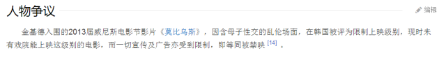 “金基德入围的2013届威尼斯电影节影片《莫比乌斯》,因含母子性交的乱伦场面,在韩国被评为限制上映级别,现时未有戏院能上映这级别的电影,而一切宣传及广告亦受到限制,即等同被禁映。”