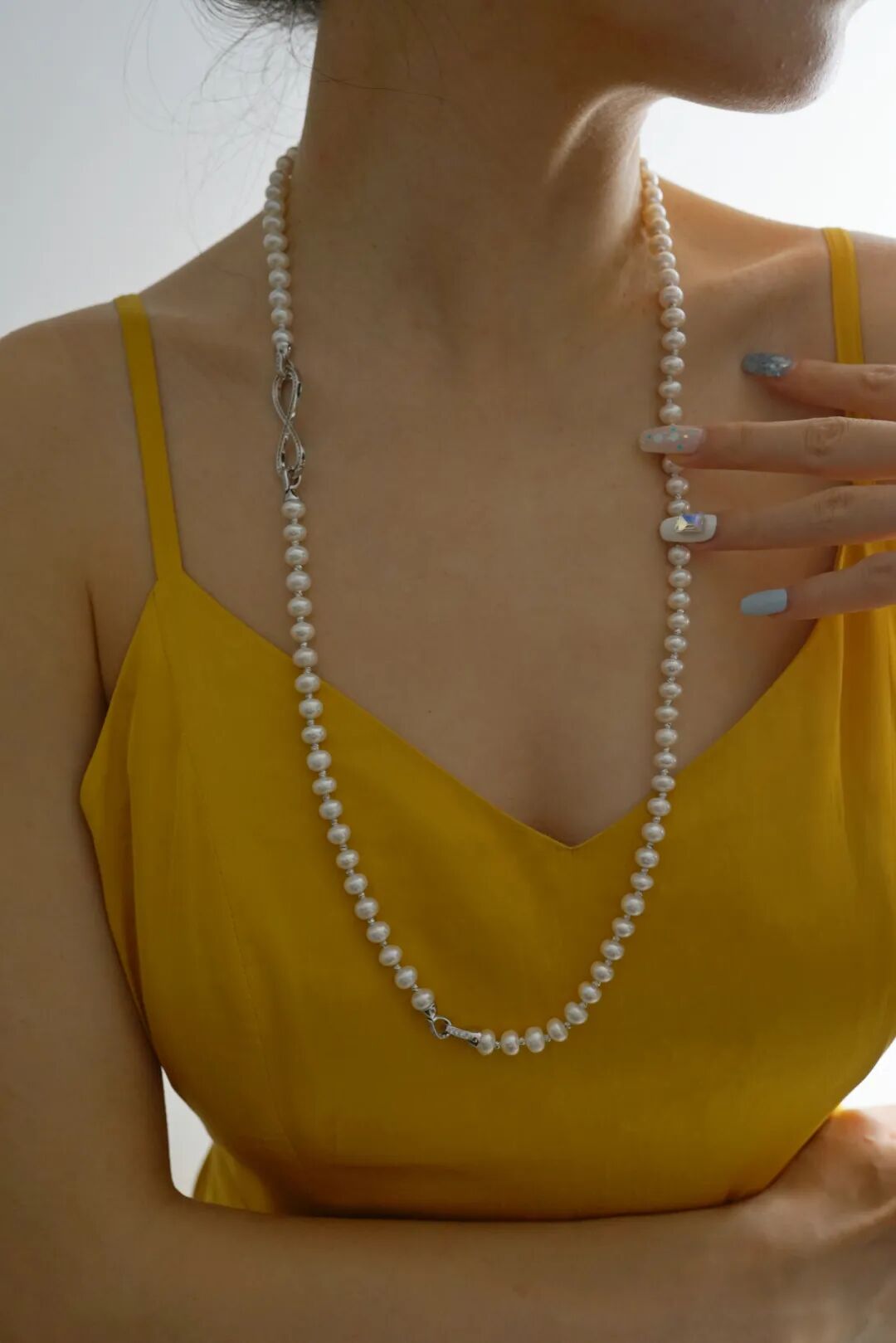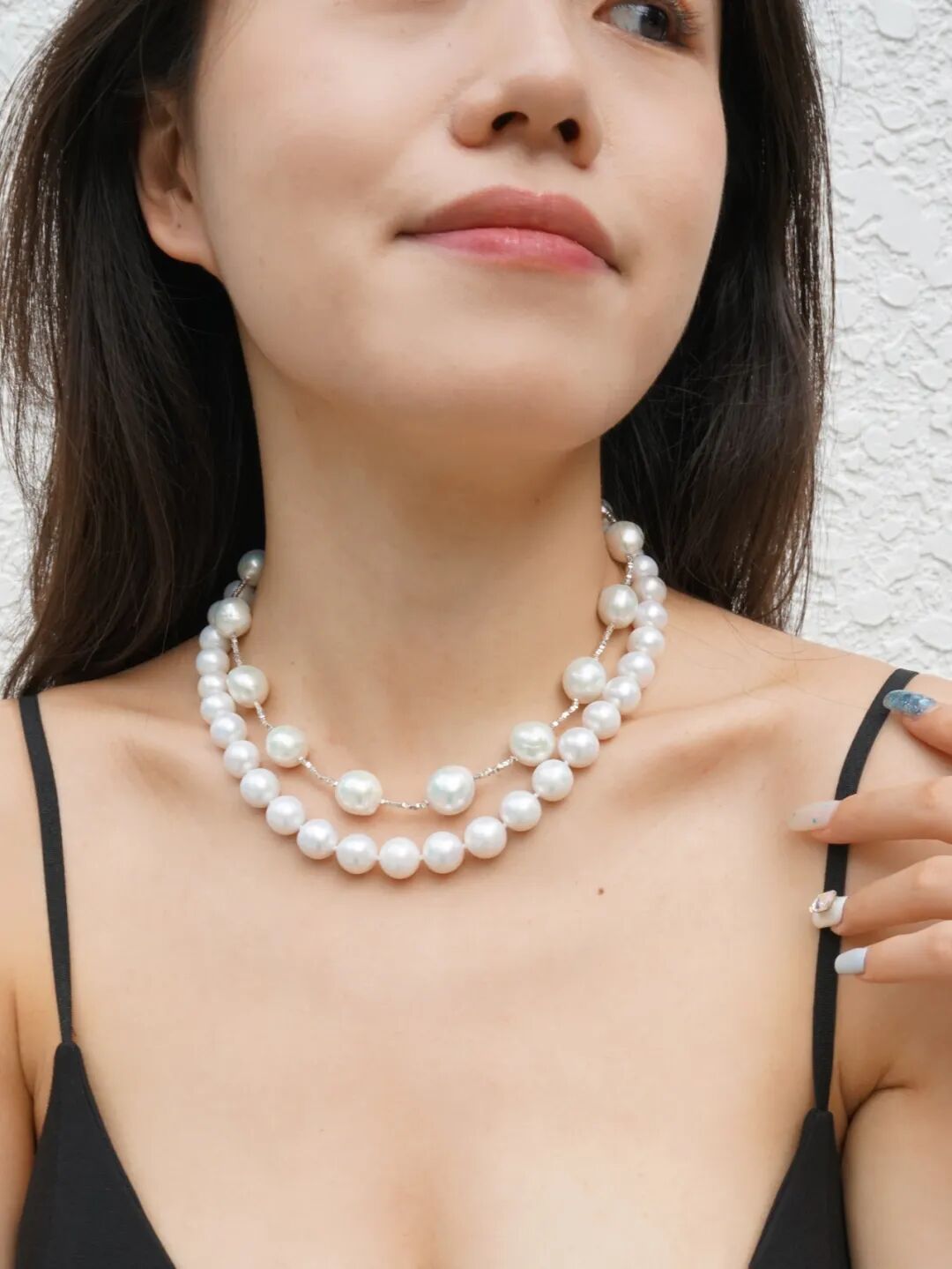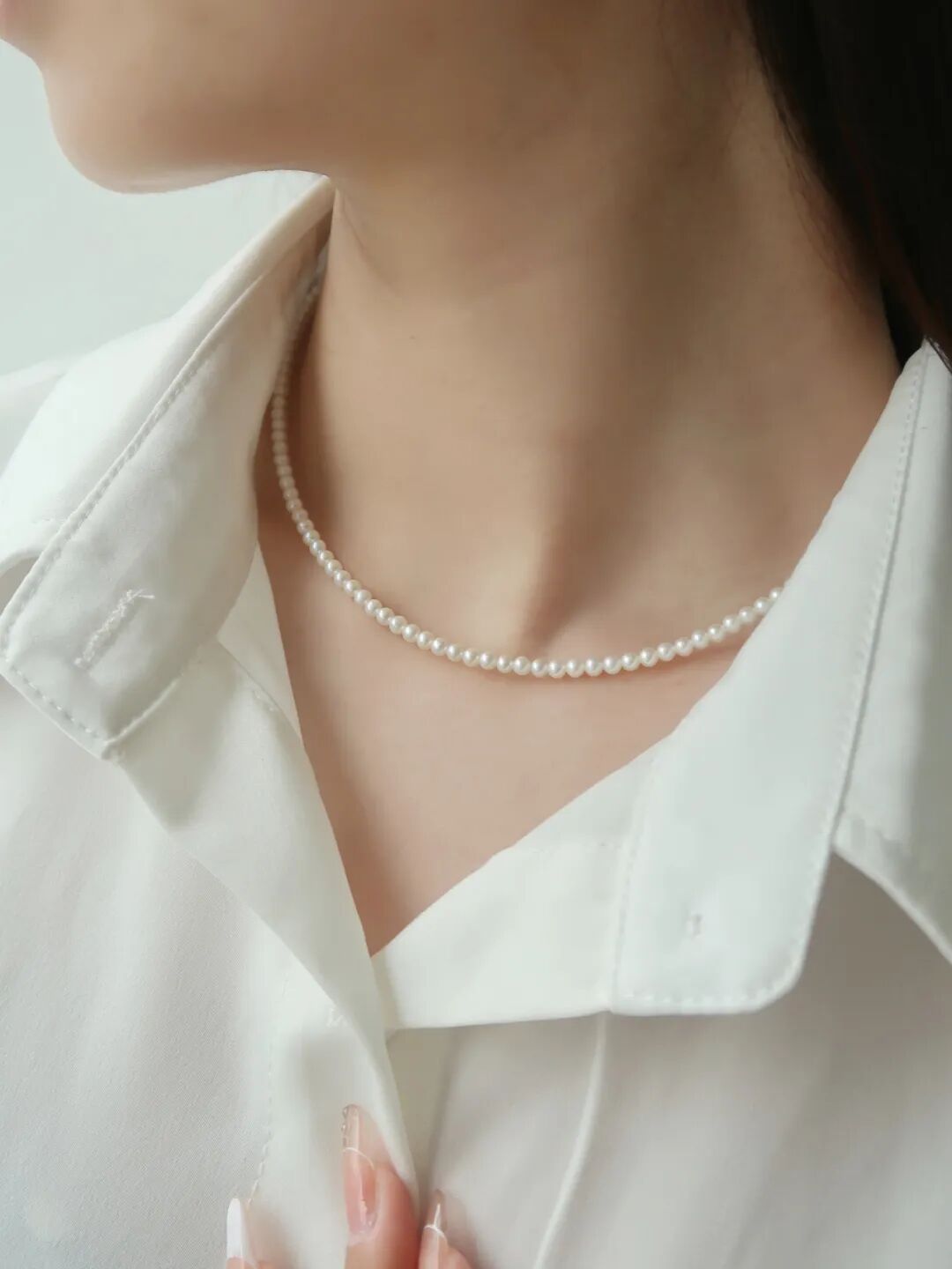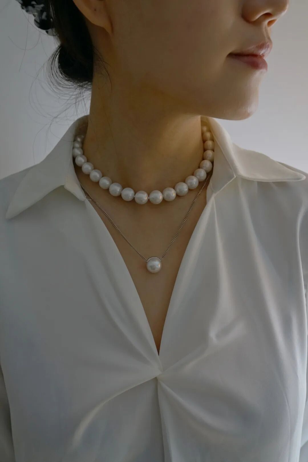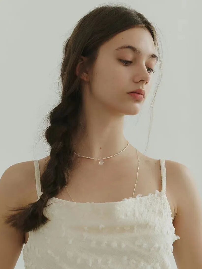 这个点位的珍珠同样可以叠搭一些金属的细项链或者珍珠吊坠来增加灵动感和层次感。