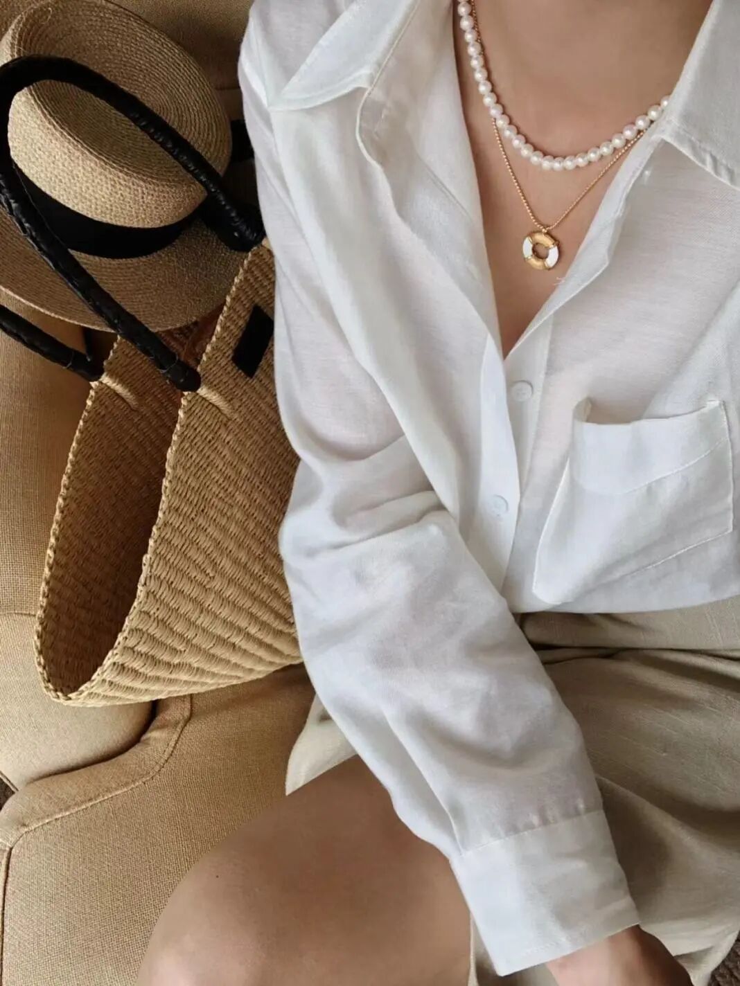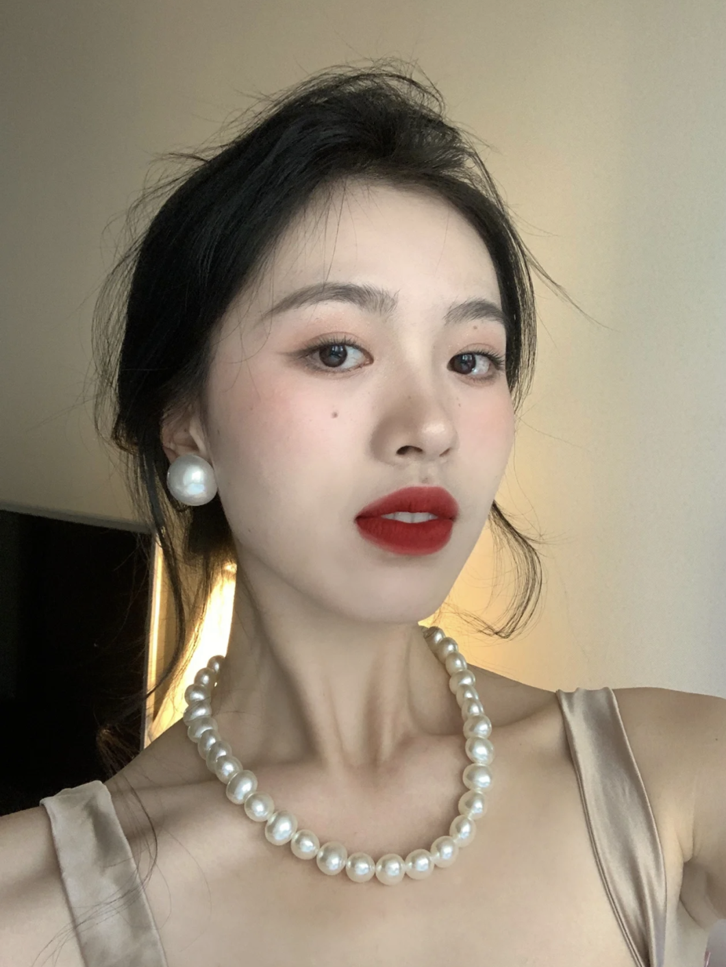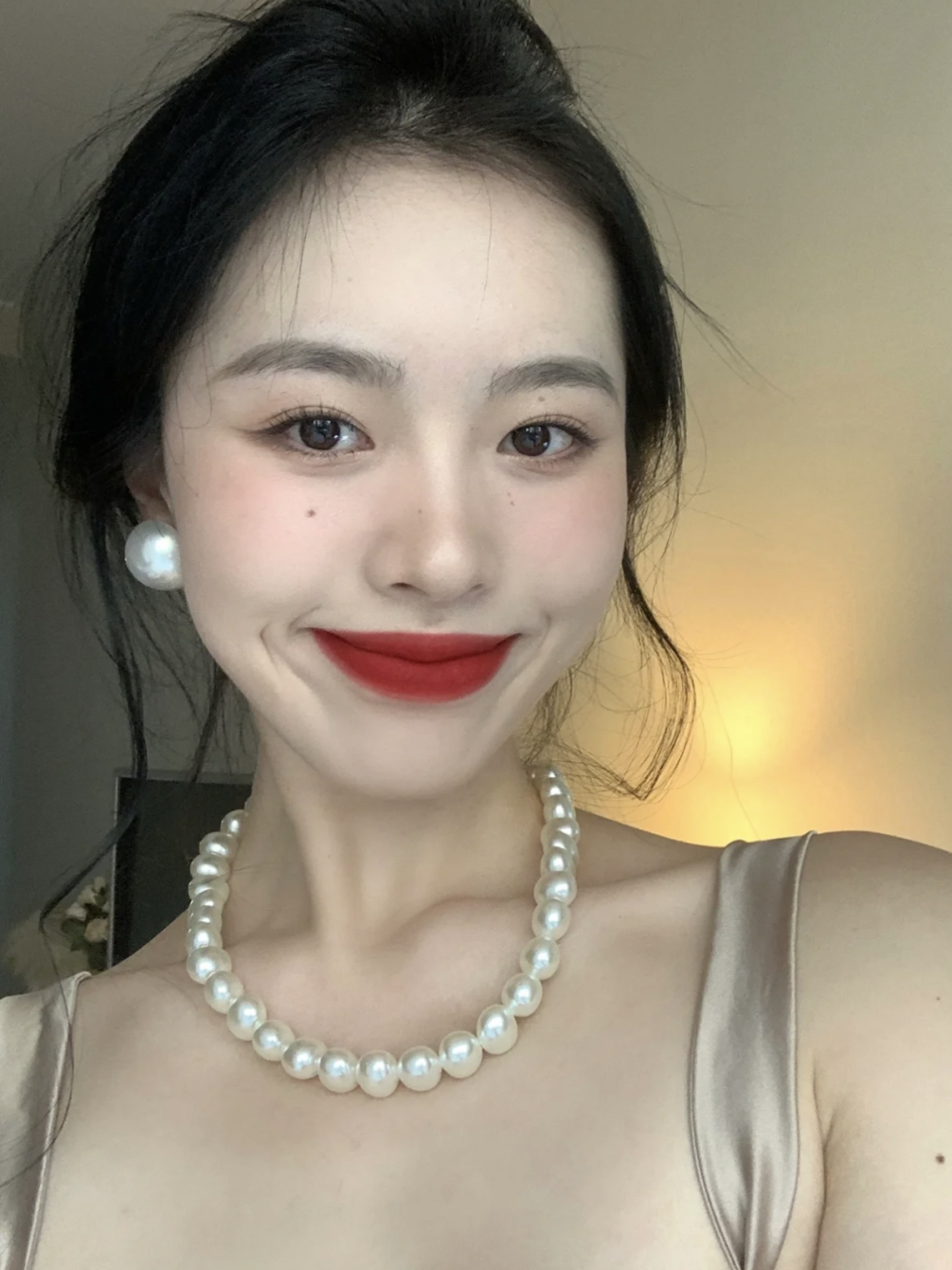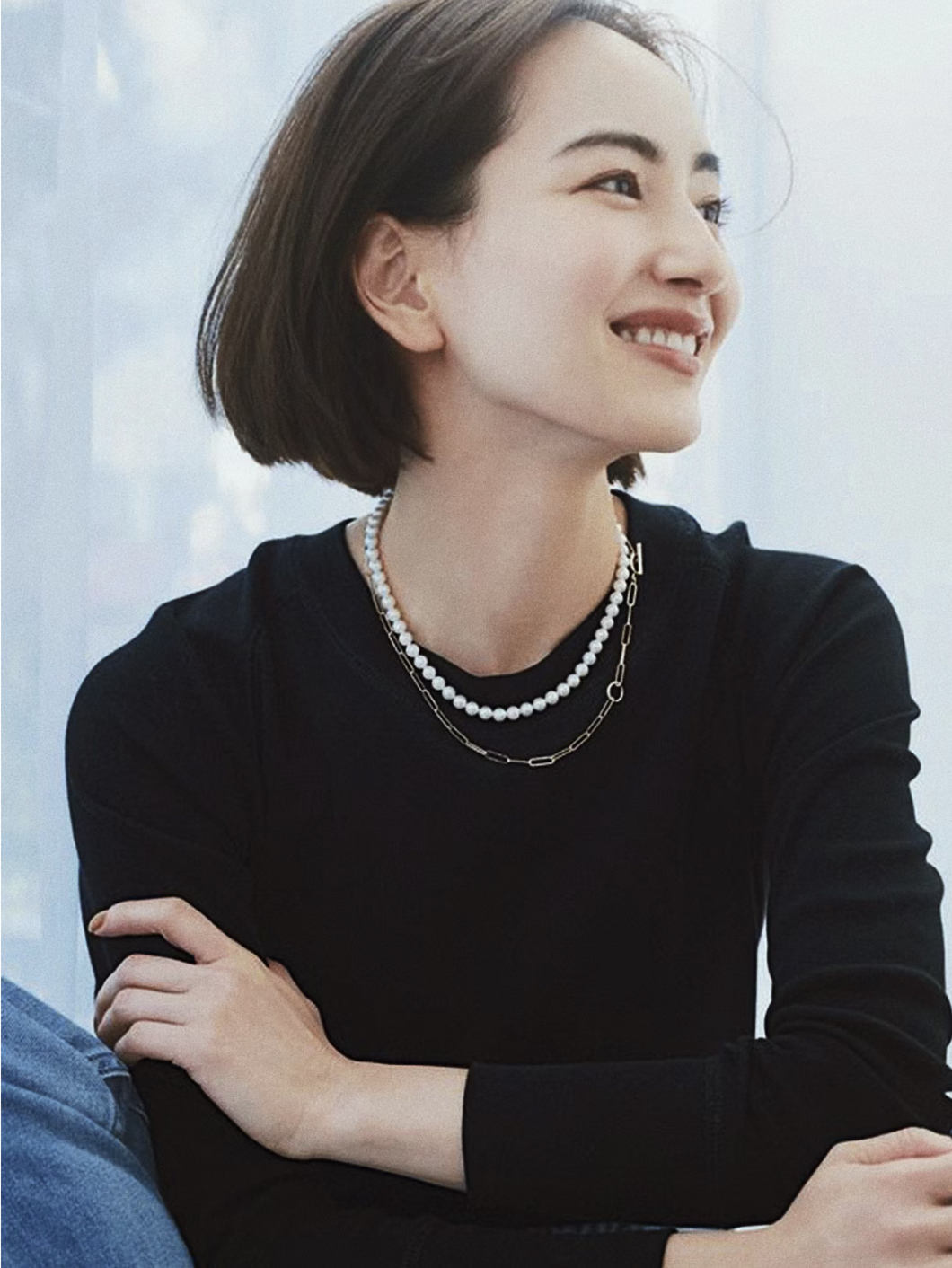 这个点位的珍珠同样可以叠搭一些金属的细项链或者珍珠吊坠来增加灵动感和层次感。