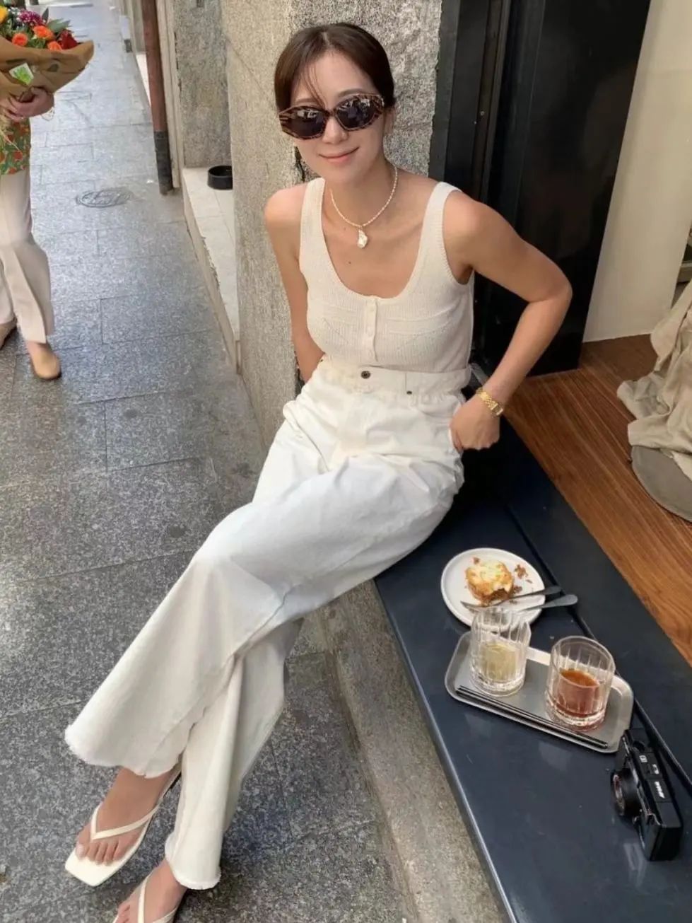 倪妮也用小米珠叠搭了大溪地的满串,让T恤都变得贵气又独特。