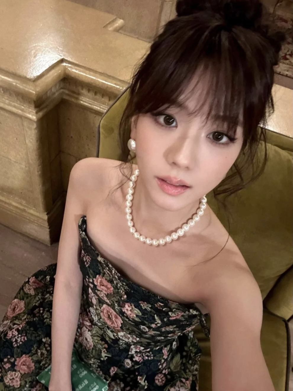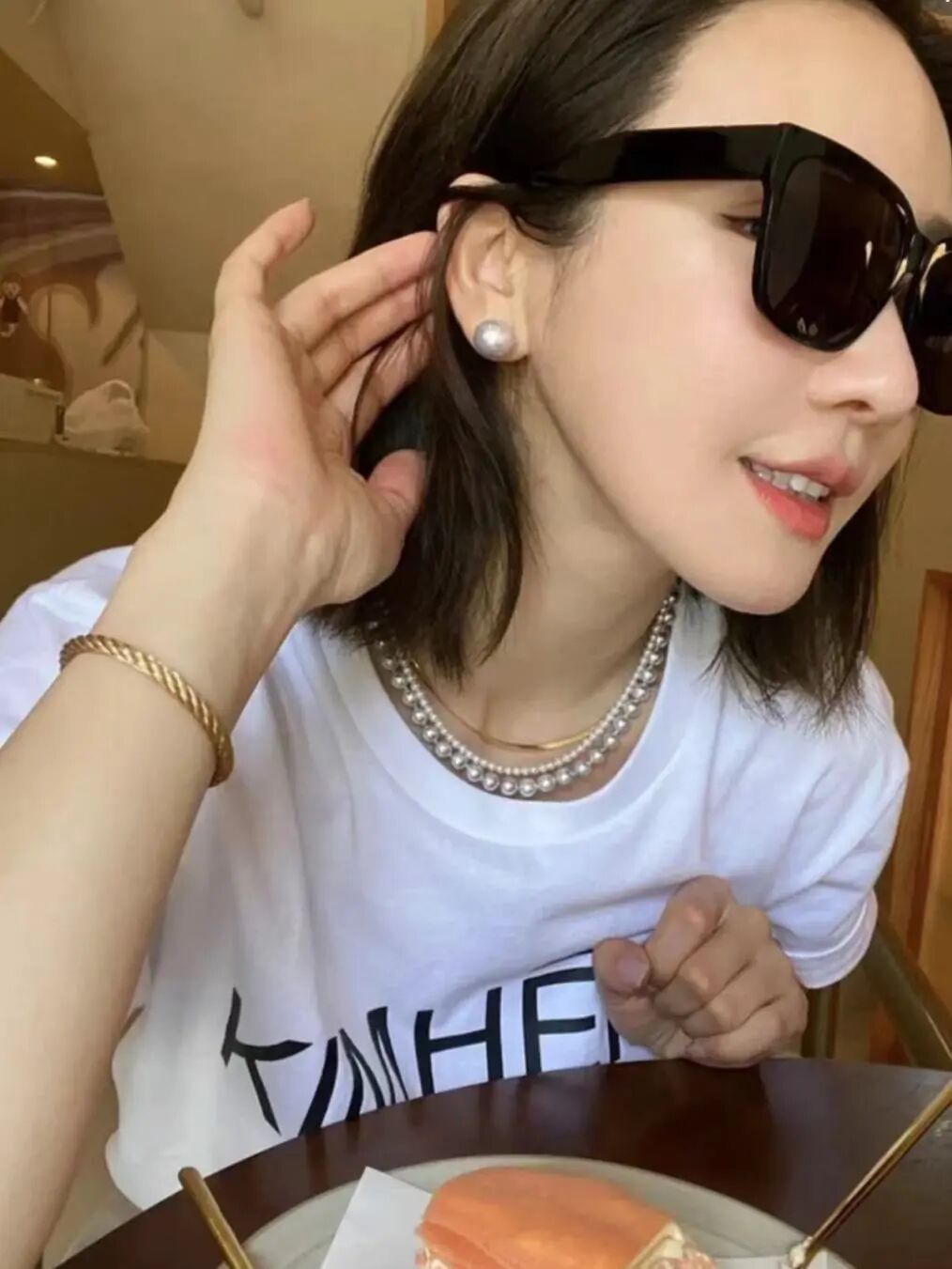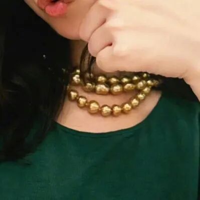 想要海水珠,姐妹们可能要放下完美主义。倪妮的这串金珠也是现在很火的巴洛克珍珠。形状虽然不规则,但是珠光和颜色都很美。