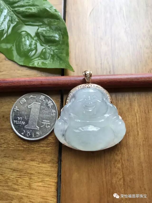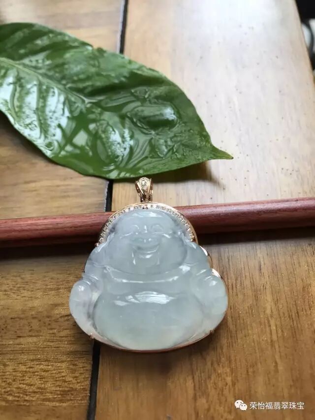 翡翠冰白弥勒佛,冰种水头足,雕工细腻入微,弥勒福相蕴玉中,笑意盎然乐悠悠。大腹翩翩,双手搭膝,赤脚趺坐,一副随心自在的样子佩戴于身,得其庇佑,祈愿万事顺心,人生如意。k金加钻石的镶嵌凸显佛像的庄严厚重。