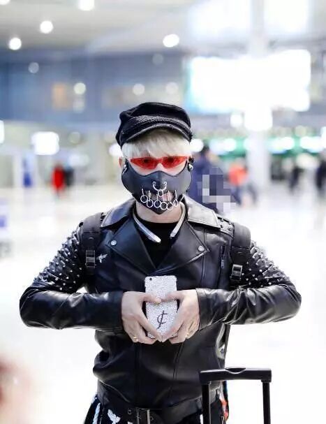 戴着一副黑色口罩,口罩外面全是铁环实在被吓得不轻!配红色菱形墨镜再次放飞自我,亮瞎了我们的眼。