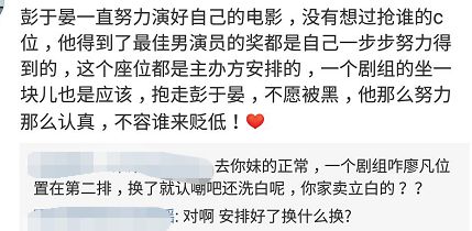 表示同剧组的柏林影帝廖凡名牌也在第二排(他当日未出席),不可能彭自己一个人在第一排,廖凡在第二排的。