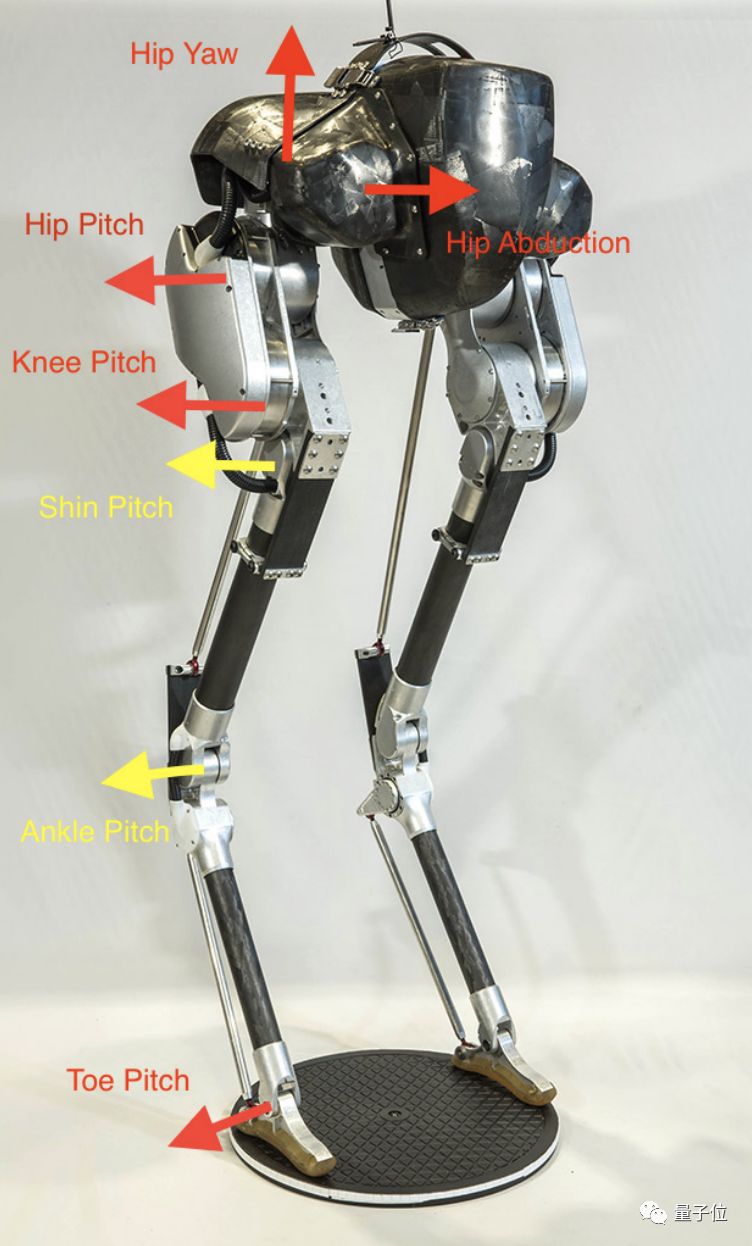 Cassie双足机器人身高大约1米,体重31千克,两条腿上有复杂的传动机制,红色箭头都是主动关节,黄色的箭头都是被动关节。