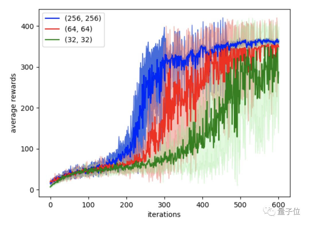 实验之后,可以看出使用更大的神经网络,就可以更快的产出更稳定的策略,比如图中的蓝色线条要明显优于红色和绿色。