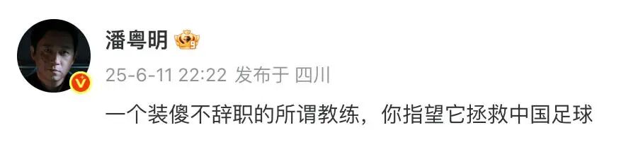 6月10日,国足1-0绝杀巴林,结束18强赛征程,6月11日,演员潘粤明发文:一个装傻不辞职的所谓教练,你指望他拯救中国足球 。