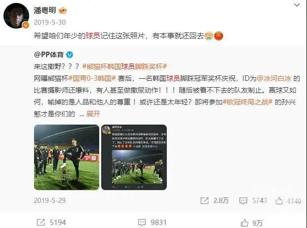 潘粤明也忍不住怒斥了韩国球员的行为:“希望咱们年少的球员记住这张照片,有本事就还回去。”