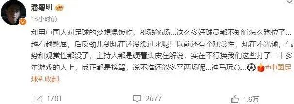 3月26日晚,潘粤明就曾发文谈“国足8场6败”,引发网友热议,相关话题词冲上热搜榜。