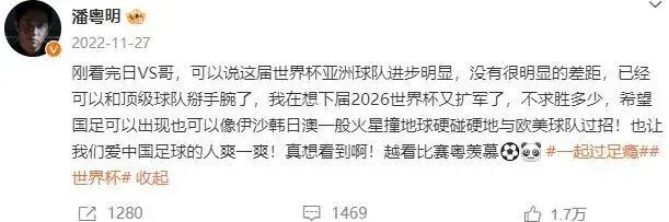 2022年11月27日晚,潘粤明发文聊世界杯观后感,他写道:“刚看完日VS哥,可以说这届世界杯亚洲球队进步明显,没有很明显的差距,已经可以和顶级球队掰手腕了。”