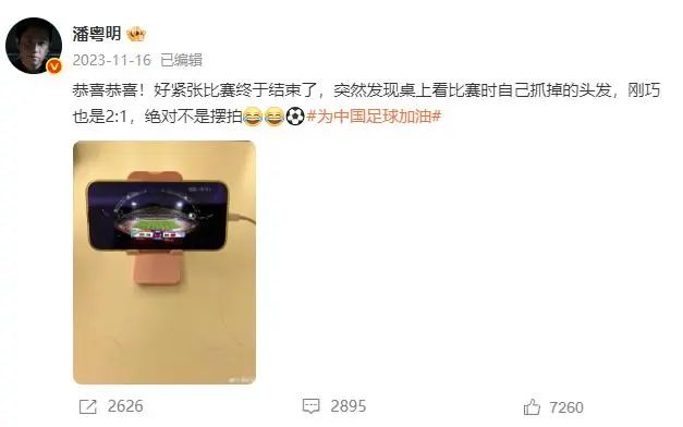 2023年11月16日,他晒出观看国足与泰国队比赛的照片,为中国足球加油。