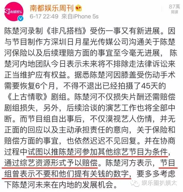 然鹅,节目组居然以让陈楚河参加其他综艺节目为协商条件,“不要谈钱的问题”,试图把赔偿问题忽悠过去。