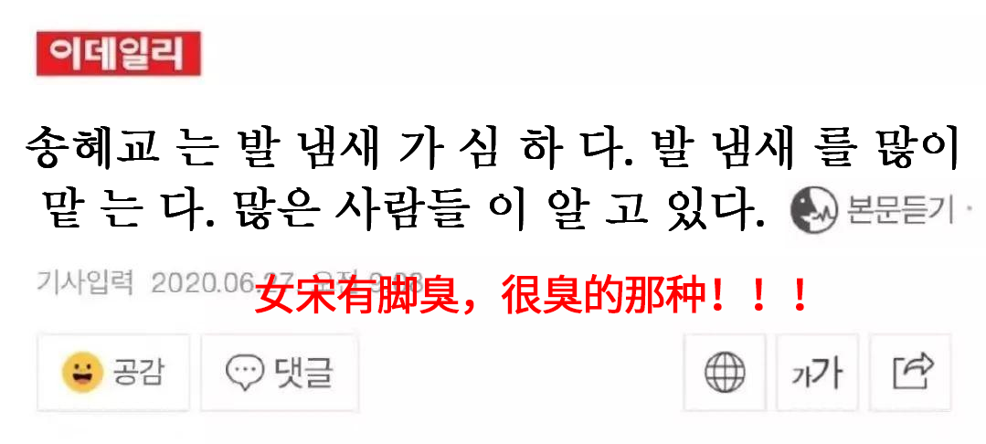 甚至于韩国国民女神宋慧乔,也被《太阳的后裔》剧组中的女剧务爆出有很重的脚臭,当时一度很多人猜测脚臭也是离婚原因之一?