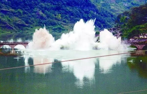 三峡工程开工之后,云阳县南溪大桥被爆破的瞬间