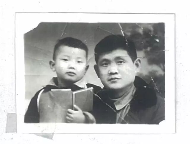 我手中拿着照相馆师傅给的道具红宝书(《毛主席语录》),与父亲合影。