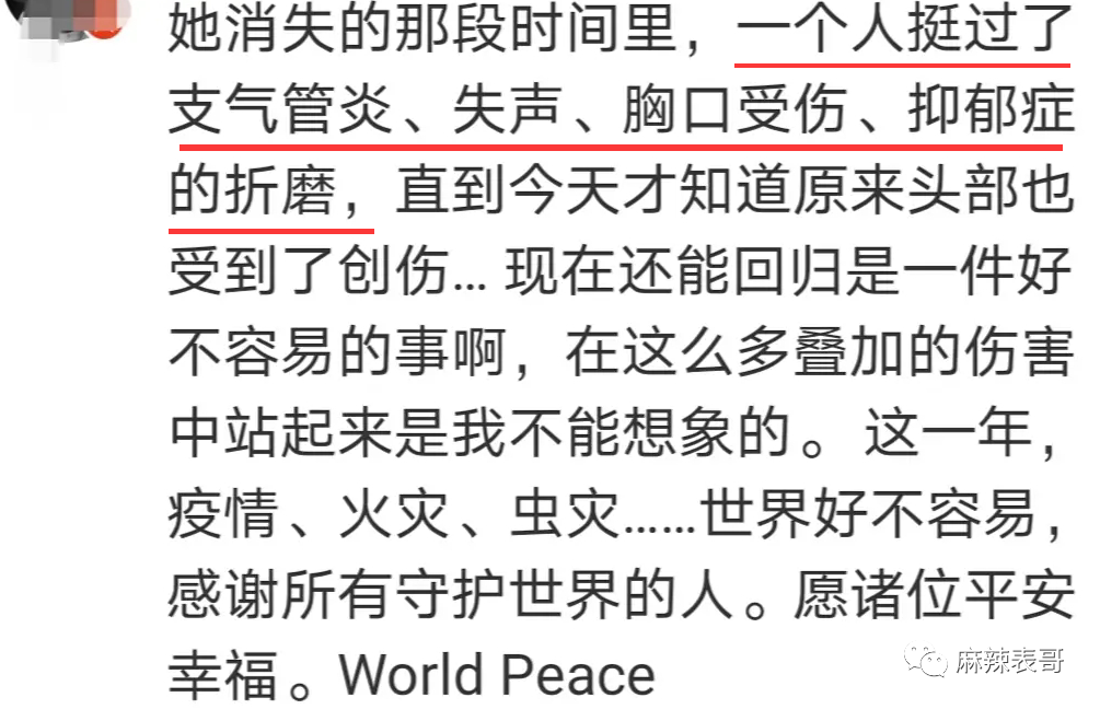 粉丝说,她消失的那段时间,一个人挺过了支气管炎、失声、胸口受伤、抑郁症的折磨。