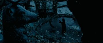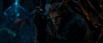 这时,野兽出现了,贝儿勇敢地用烛台照亮了野兽的脸,却被狰狞的面容吓了一跳。