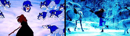 在她离开城堡遭遇狼群围攻时,野兽及时出现救美。