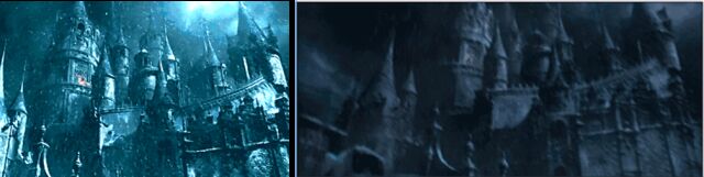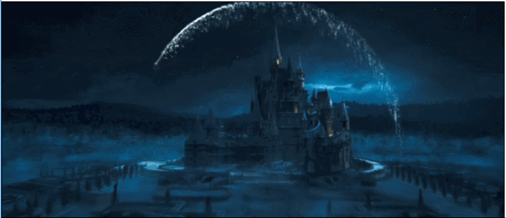 一个全景镜头就将小镇的阴郁氛围展露无遗,而别出心裁的是,野兽的城堡与迪士尼LOGO融为了一体。