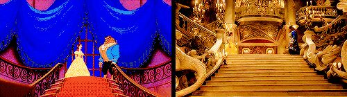当野兽带着贝儿参观华丽的舞厅时,他们两不自觉地就跳起了华尔兹。