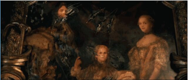 墙上挂着一幅画像,是野兽还是王子时期的家族肖像,和动画版一样被愤怒的野兽撕得破破烂烂。