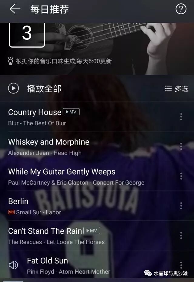 (以今日推荐为例,前六首歌中,三首是通过我个人的喜好音乐人推荐的,分别是blur、Eric Clapton以及Pink Floyd,另外三首分别是器乐摇滚、民谣和流行。)