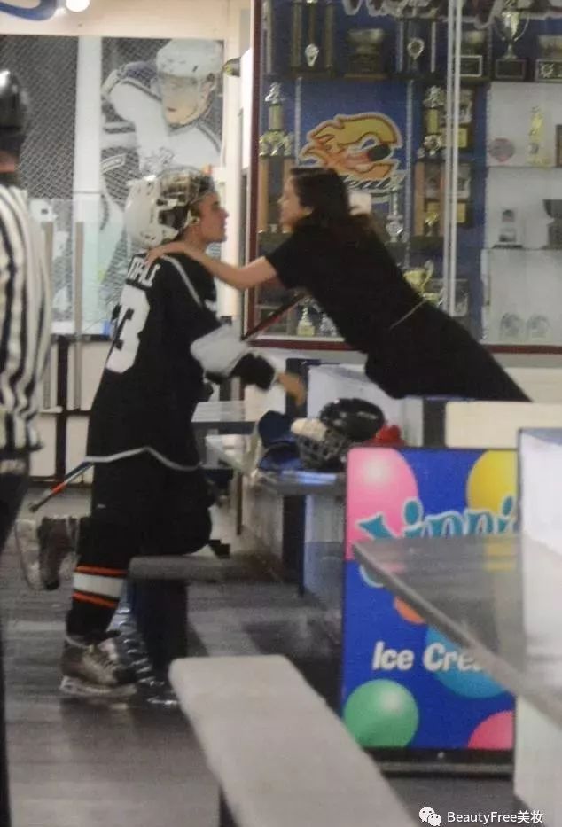 Selena 亲自到球场支持 Bieber 的冰上曲棍球比赛~