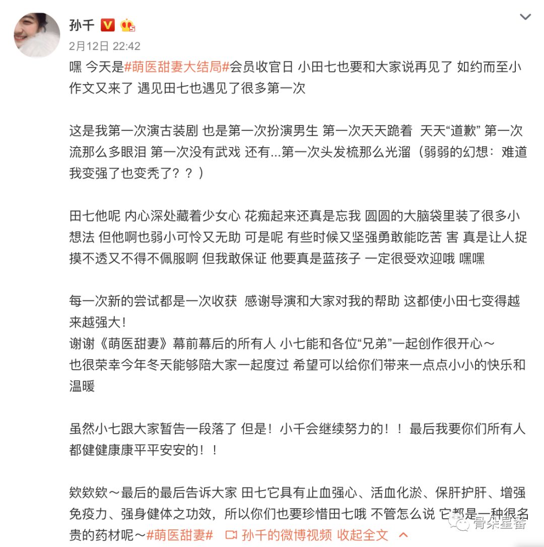 经历了这些之后,她在给《萌医甜妻》大结局的小作文里这样写道,“田七它具有止血强心、活血化淤、保肝护肝、增强免疫力、强身健体之功效,所以你们也要珍惜田七哦”。功效甚好、值得珍惜,角色田七之于孙千,也是这样一种存在。
