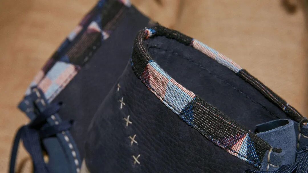 本季英国店铺END.与Clarks Originals再度联手,带来向游牧民族致敬的新款Wallabee。鞋款的莫卡辛灵感结构与舒适的绉胶底是游牧民喜爱的风格,藏青色调呈现。鞋领处辅以编织面料装饰,后跟点缀十字刺绣,另外还附有流苏与串珠缀饰。此款预计5月29日发售。