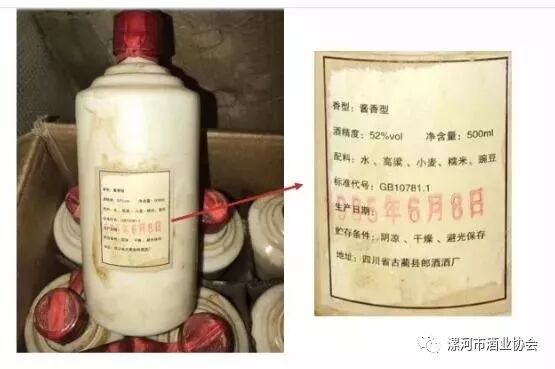 此外, 正品郎酒的厂名为“四川省古蔺县郎酒厂”、“四川省古蔺郎酒厂”。造假者有着非凡的创意能力,杜撰出“四川省古蔺县郎酒酒厂”这样的厂名,一字之差,谬之千里。