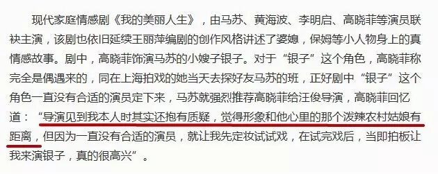 像才出道没几年就在《我的美丽人生》里饰演了一个直爽泼辣的农村姑娘,试戏时连《我的美丽人生》的导演也抱着怀疑的态度,但试完戏后却当即拍板让高晓菲来饰演这个泼辣的农村姑娘。
