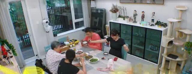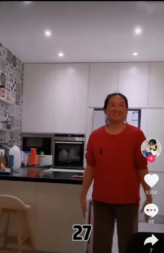 而从这个一家人一起锻炼的视频来看,她家中是开放式的厨房,一整面墙的储物柜十分抢镜,远处一眼望不到尽头的房间、走廊,更是让这个地方看起来大的有些空旷。