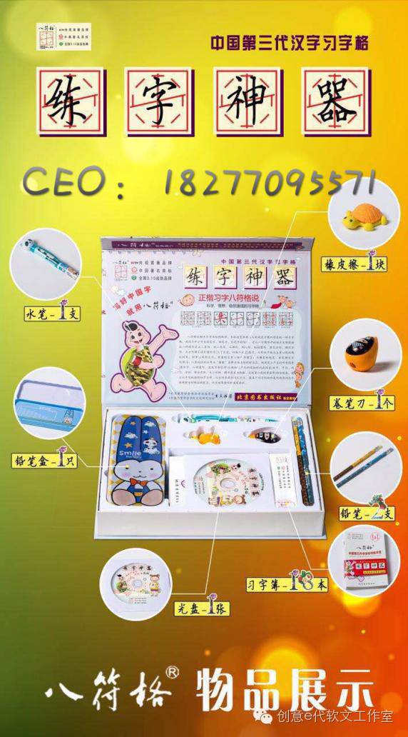 那么,如何通过八符格练字神器练得一手好字呢?具体的方法就是每天按照八符格大礼包里面提供的练习册和方法练习15分钟, 3天就可以改变笔锋,18天就能够让笔者的字体焕然一新!只要坚持练习三周,仅仅三周,即可写出一手让周围的人羡慕的好字。“八符格”练字神器主要包含18本练习本,1张光盘,1个铅笔盒,1个发光水笔 ,2个铅笔,1个卷笔刀,1个橡皮,一个纸质环保手提袋。一箱一共有十套。那么八符格八符格怎么代理?而这么多东西,现在代理的价格只需要294元,因为八符格市场前景广阔,发展迅速,所以趁着电商的大风,踏着微信的平台,让更多的人了解八符格练字神器。