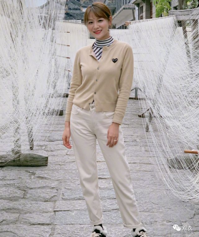 比起上一身很青春系的穿衣,叶一茜这身套装就显露出了自己的成熟美。裸色针织外套+白色长裤的搭配是让叶一茜的形象一下显得很古典,不知道如此打扮下的她是否会让你们想到那种民国剧中的女子形象呢?她这身看似色彩单一的服装中因为上身内搭黑白条纹衫的出现又是多了一种吸睛感,这种打扮下的叶一茜妥妥的就是一种大家闺秀的形象呈现。