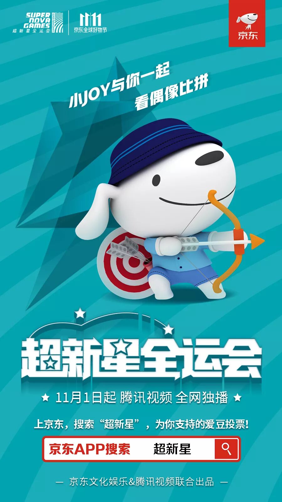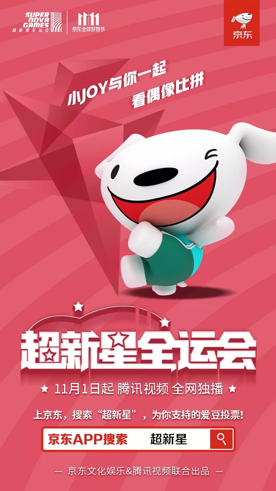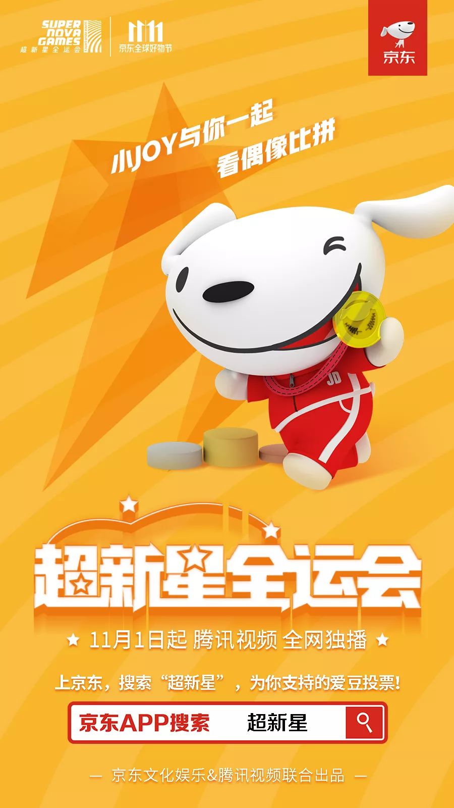10月31日-11月8日中午12点整,登录京东投票,为自家爱豆打CALL,你还有机会获得超新星全运会直播门票、明星合影、爱豆签名照和优惠券等福利!