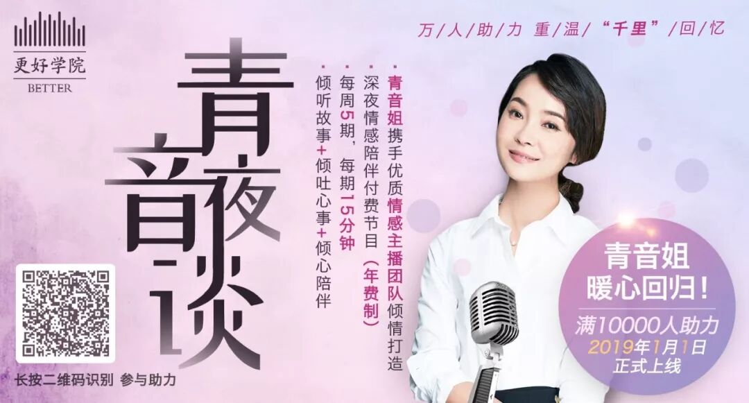 2019年1月1日22:00前,满一万人助力,即可成功呼唤青音重回夜间节目!在深夜抚慰你的心灵,陪伴你入眠!同时还将获得音符定制手帐、线下活动代金券等超值福利!(若助力人数不足,将取消项目,并全额退回助力费用。)
