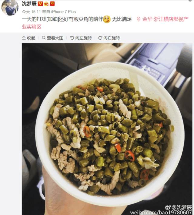 12日下午,沈梦辰在微博晒出自己在剧中吃的盒饭说:“一天的打戏,还好有酸豆角的陪伴,无比满足。”看起来虽然肉少了点儿,不过应该挺下饭的。