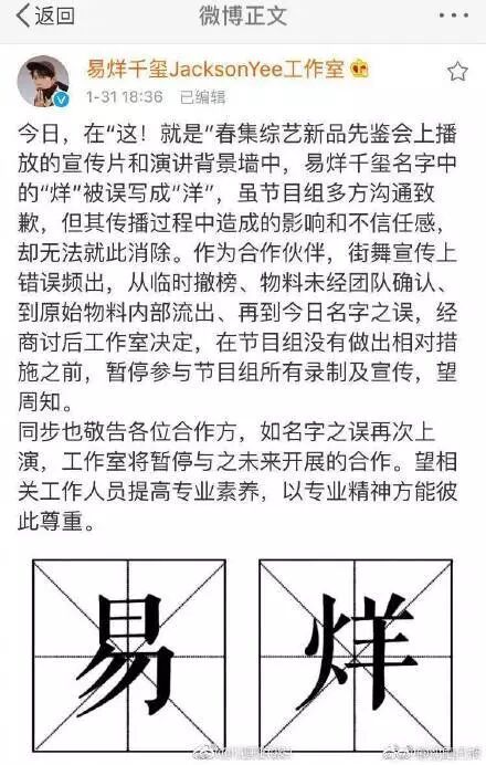 在海报中把易烊千玺的名字写错。