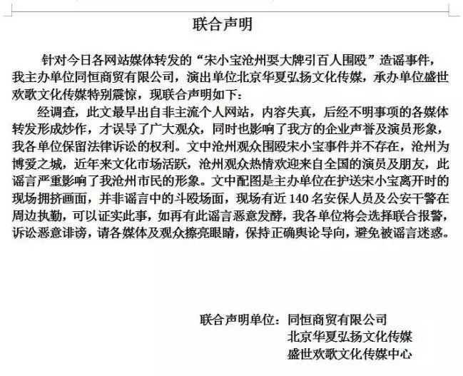 经调查,此文最早出自非主流个人网站,内容失真,后经不明事项的各媒体转发形成炒作,才误导了广大观众,同时也影响了我方的企业声誉及演员形象,我各单位保留法律诉讼的权利。文中沧州观众围殴宋小宝事件并不存在,沧州为博爱之城,近年来文化市场活跃,沧州观众热情欢迎来自全国的演员及朋友,此谣言严重影响了我沧州市民的形象。文中配图是主办单位在护送宋小宝离开时的现场拥挤画面,并非谣言中的斗殴场面,现场有近140名安保人员及公安干警在周边执勤,可以证实此事,如再有此谣言恶意发酵,我各单位将会选择联合报警,诉讼恶意诽谤,请各媒体及观众擦亮眼睛,保持正确舆论导向,避免被谣言迷惑。