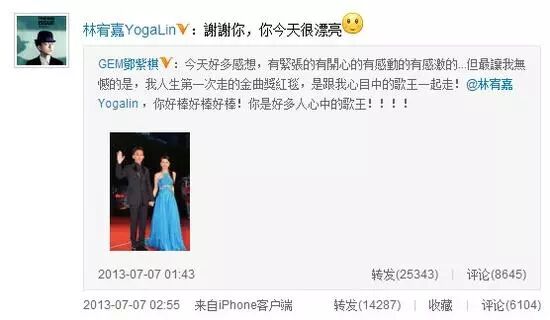 ▽ 两人的微博互动,林宥嘉的回复。。。emmm,挺冷淡的。。。