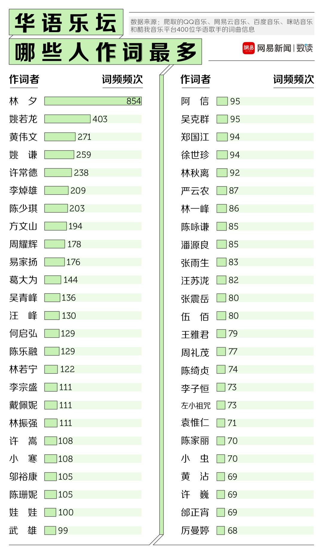 而香港乐坛填词领域的标杆性人物,林夕,则以854的频次居于榜首。