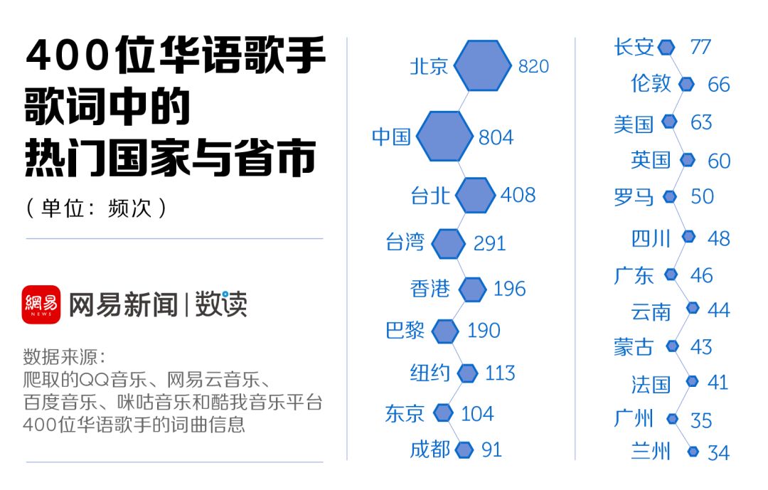 在作词者榜单之上,近八成为台湾乐坛的填词人,但歌词中最为热门的城市却是北京。海外的巴黎、东京和纽约是歌词中的常客,即便在现在,也是不少人心中最时尚、代表潮流的地方。不少专辑的企划文案和MV中,更是很爱以在海外录制、拍摄、取景为宣传点。
